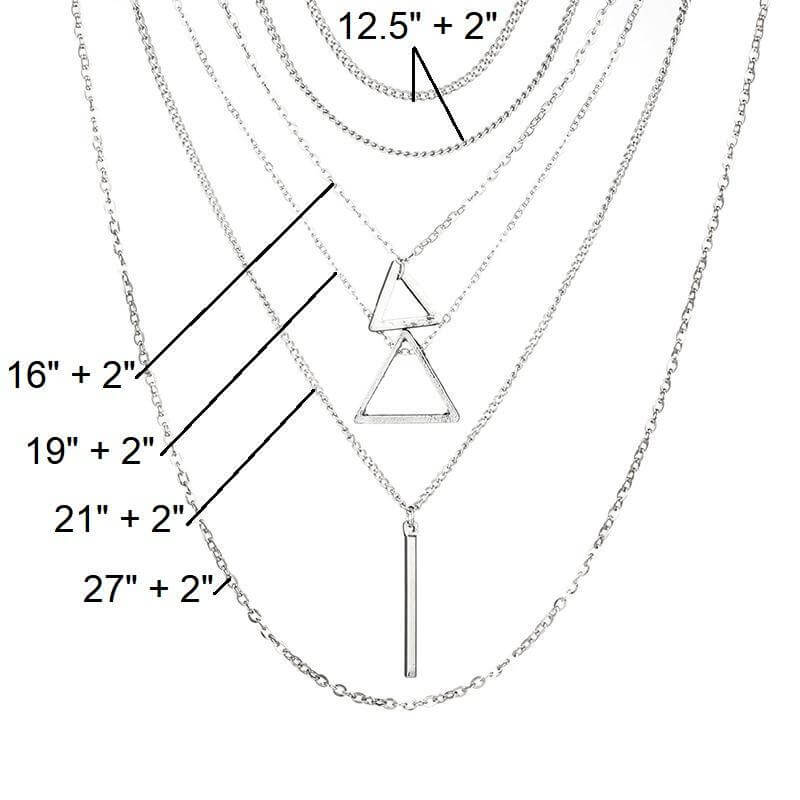 Double triangle multilayer necklace featuring 6 layers with triangle shapes and a vertical bar in stylish silver.