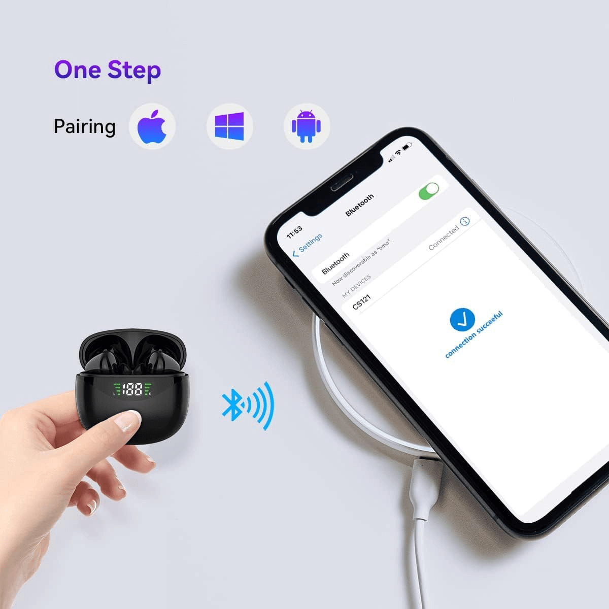 One Step PairingFirst pairing, just open the case, no need to take out earbuds, select "CS121" on your phone's Bluetooth menu, and both ear buds will connect with your phone immediately. Wireless earbuds can auto-connect with your last device next time. Bluetooth earphones with touch control, you can control music play/pause, previous/next track, volume+/-, answer/reject, end calls and enable voice assistance by tapping on earbuds. No need to adjust these on your phone.