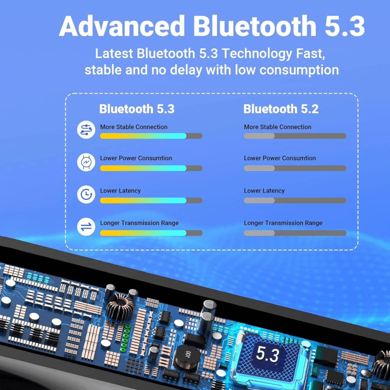 The wireless earbuds with latest Bluetooth version 5.3 for fast and stable use. It makes the Bluetooth headphones have a stronger signal and sensitive transmission, providing you with an uninterrupted call and music experience as well as noise cancellation. (During the call, make a bilateral pairing to ensure better call quality. )The ear buds restore the exquisite vocal instrumental music,