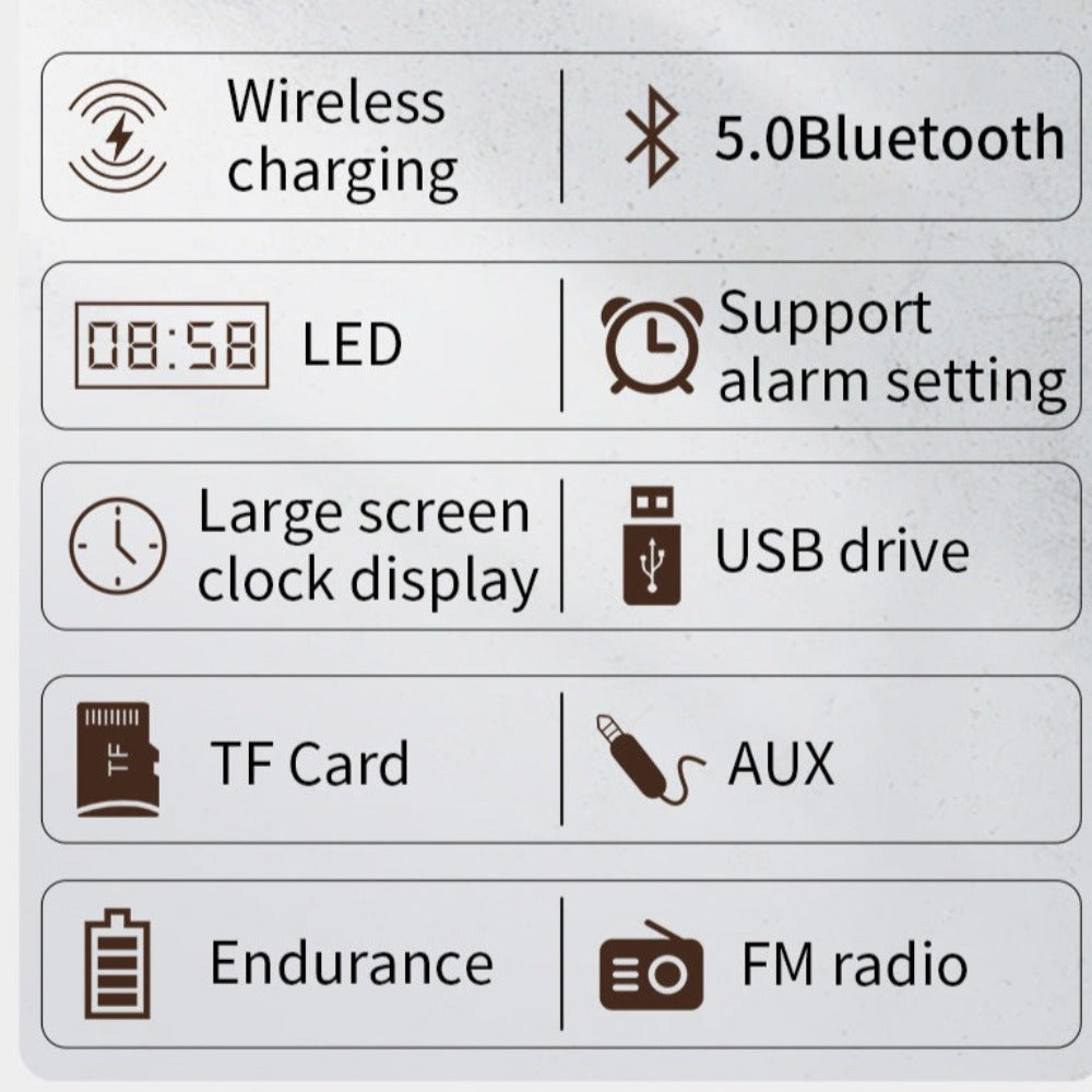 Bluetooth Speaker, Wireless Charger, Alarm Clock & FM Radio all in one!