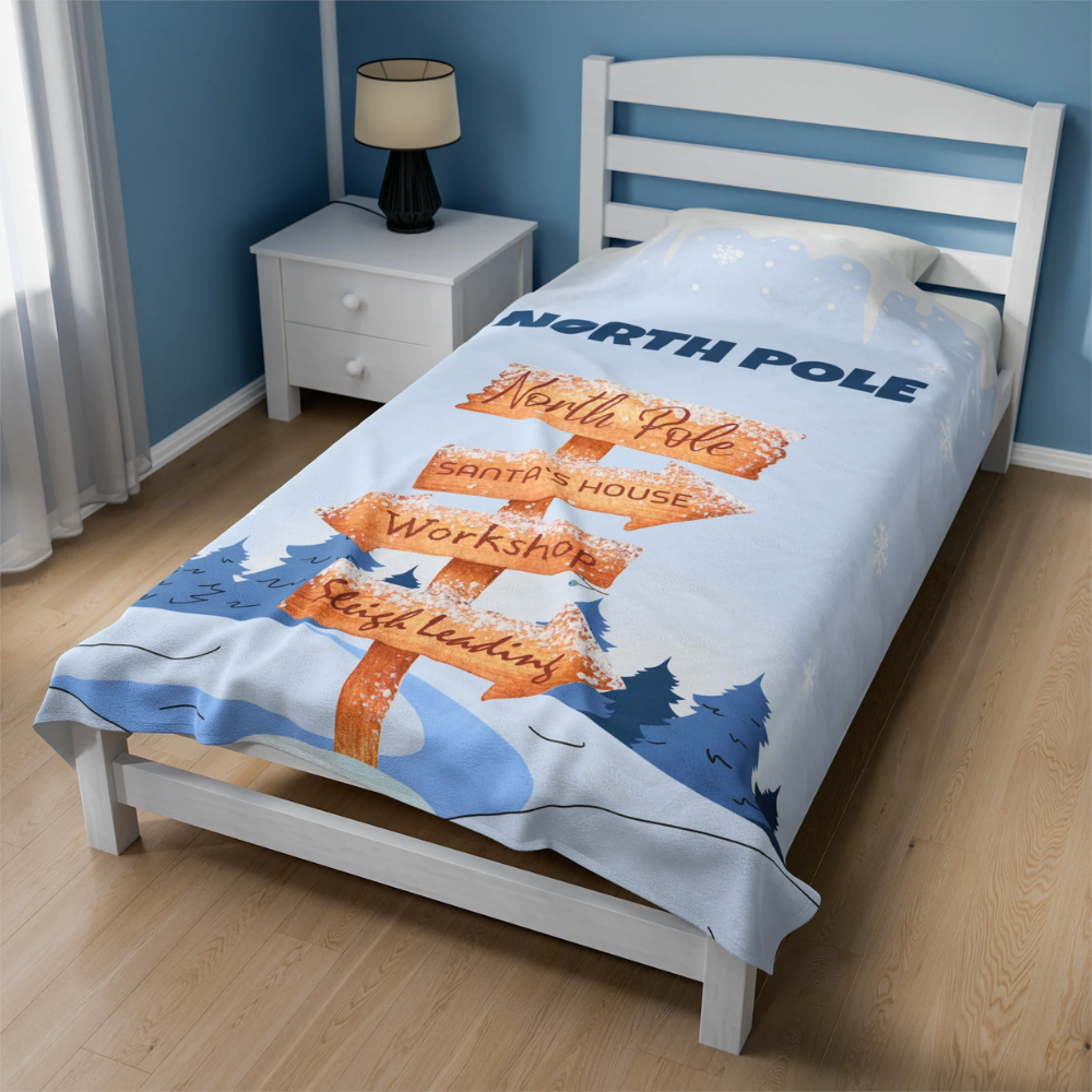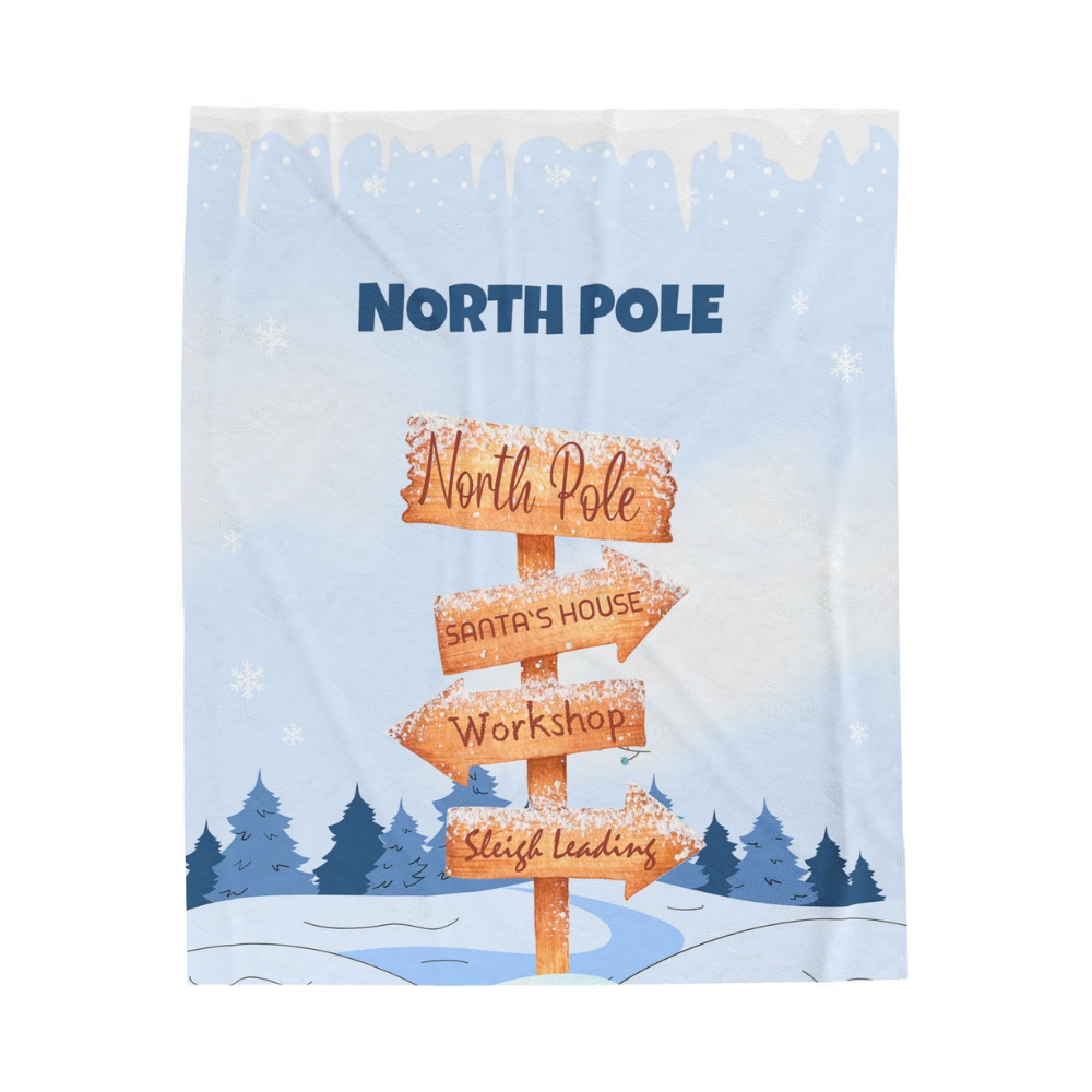 Get cozy with our North Pole Navigation Edition Plush Blanket Throw. Embark on a festive journey with charming illustrations of the North Pole and directional signs leading to Santa's home and workshop. This soft and stylish blanket is the perfect addition to your holiday decor, combining warmth with whimsical holiday magic.