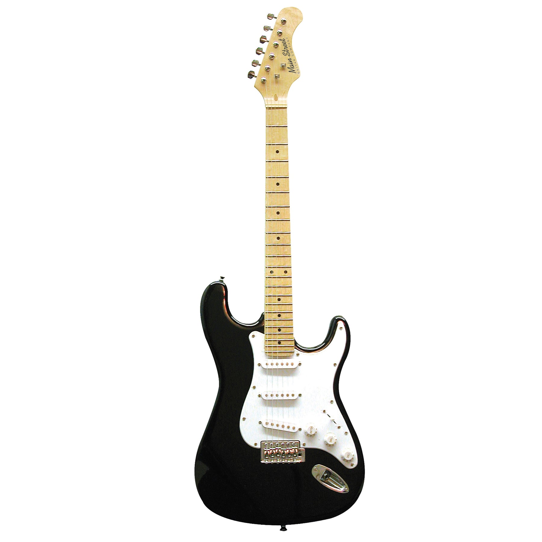 Main Street MEDCBK Double Cutaway Electric Guitar in high-gloss black finish brings the rock at a price that rolls. High-gloss black finish. The MEDCBK has a solid Alder body with a Maple neck and fretboard. Its vintage design bridge, pickups and tremolo bar give that classic sound. Solid body and Bolt-on neck with truss rod. Package includes guitar, tremolo bar and instrument cable.