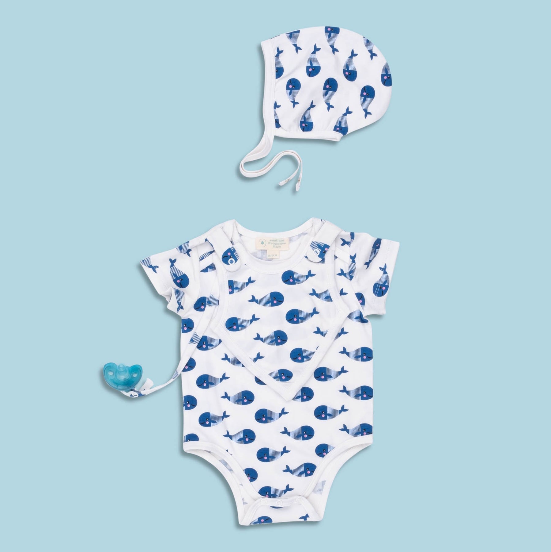 A bodysuit with an attachable bib. Additional Combinations: 1- attach a bib and pacifier strap at the same time. 2- attach a bib and hat at the same time. Hat and Pacifier Strap in above combination sold separately.