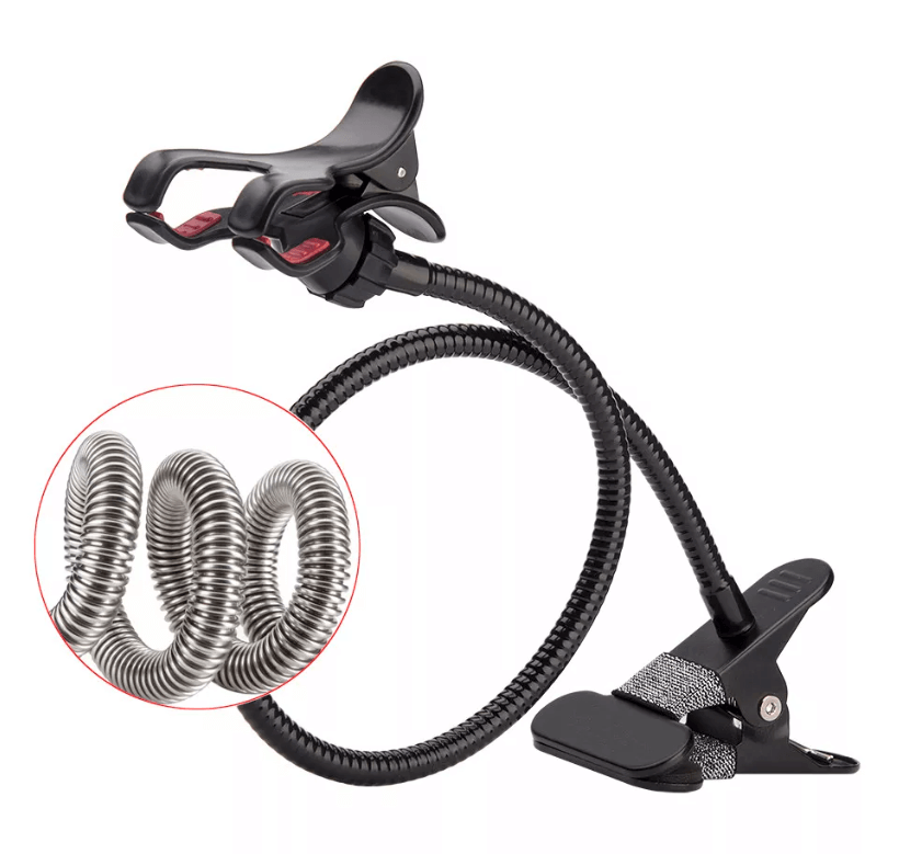 The universal smartphone desk grip mount fits for most mobile phones. It has four clamps that sink in to grab your device for a strong stable hold. Attractive rubber pieces carefully hug your smartphone's body safely. A flexible long wire can be adjusted to any comfortable viewing angle or distance you desire. Mount to side of a table, desk, door, etc. via a sturdy metal spring clamp.