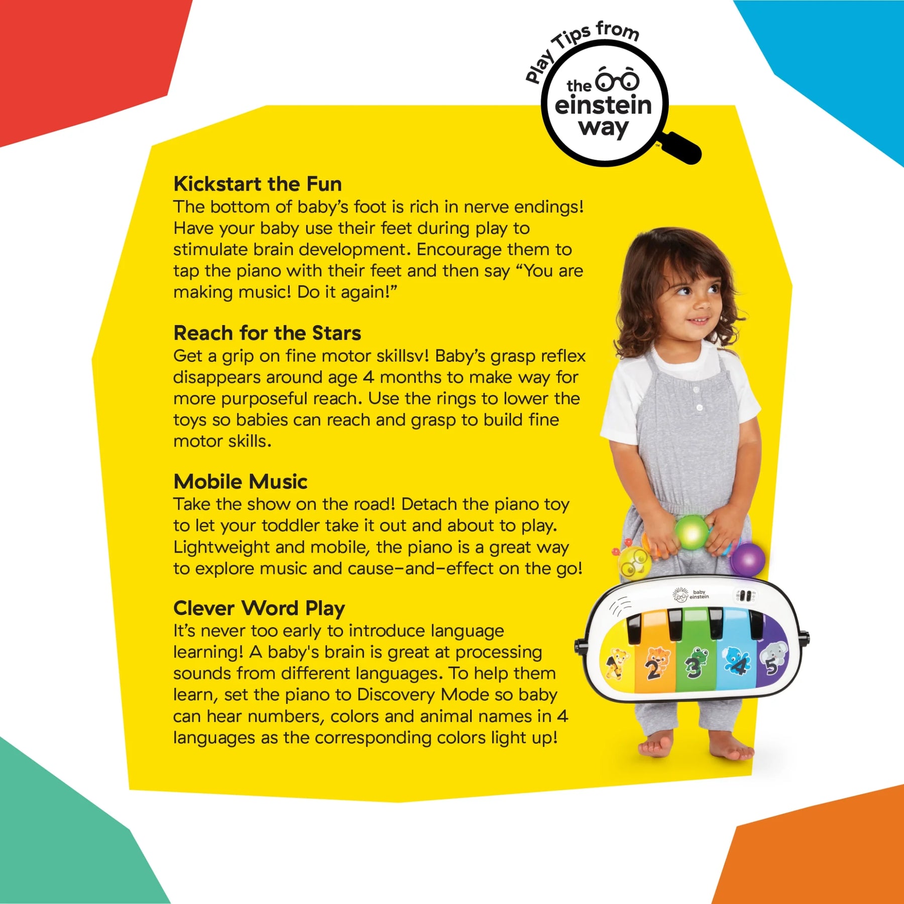 Baby Einstein Kickin' Tunes 4-in-1 Baby Activity Gym with Piano, Orchestrate the perfect playtime for your newborn with the Baby Einstein 4-in-1 Kickin' Tunes Music and Language Discovery Gym. Your baby's musical genius will stretch from their head to their toes when it comes to this baby play gym and toy piano. Thanks to Magic Touch technology, the baby can play the piano with just a press of a finger or the kick of a foot! The included prop pillow helps make tummy time a more comfortable and enjoyable experience while your baby takes in the world. Using all senses, the baby will explore 7 interesting toys, 70+ melodies sounds, and 4 languages (English, Spanish, French, and German).