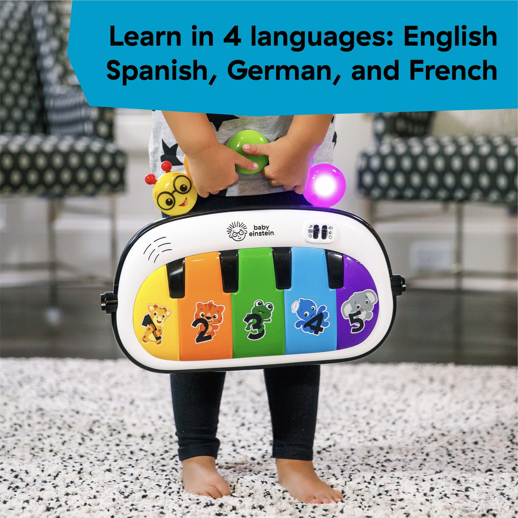 Piano toy features 2 modes of play: Free Play piano mode and Melody mode, introduces phrases in 4 languages: English, Spanish, French and German, bring the piano on the go