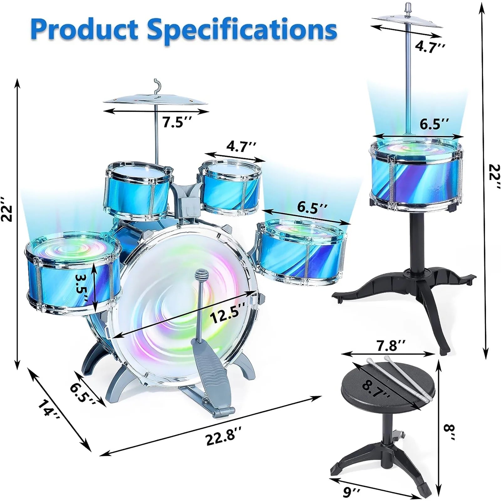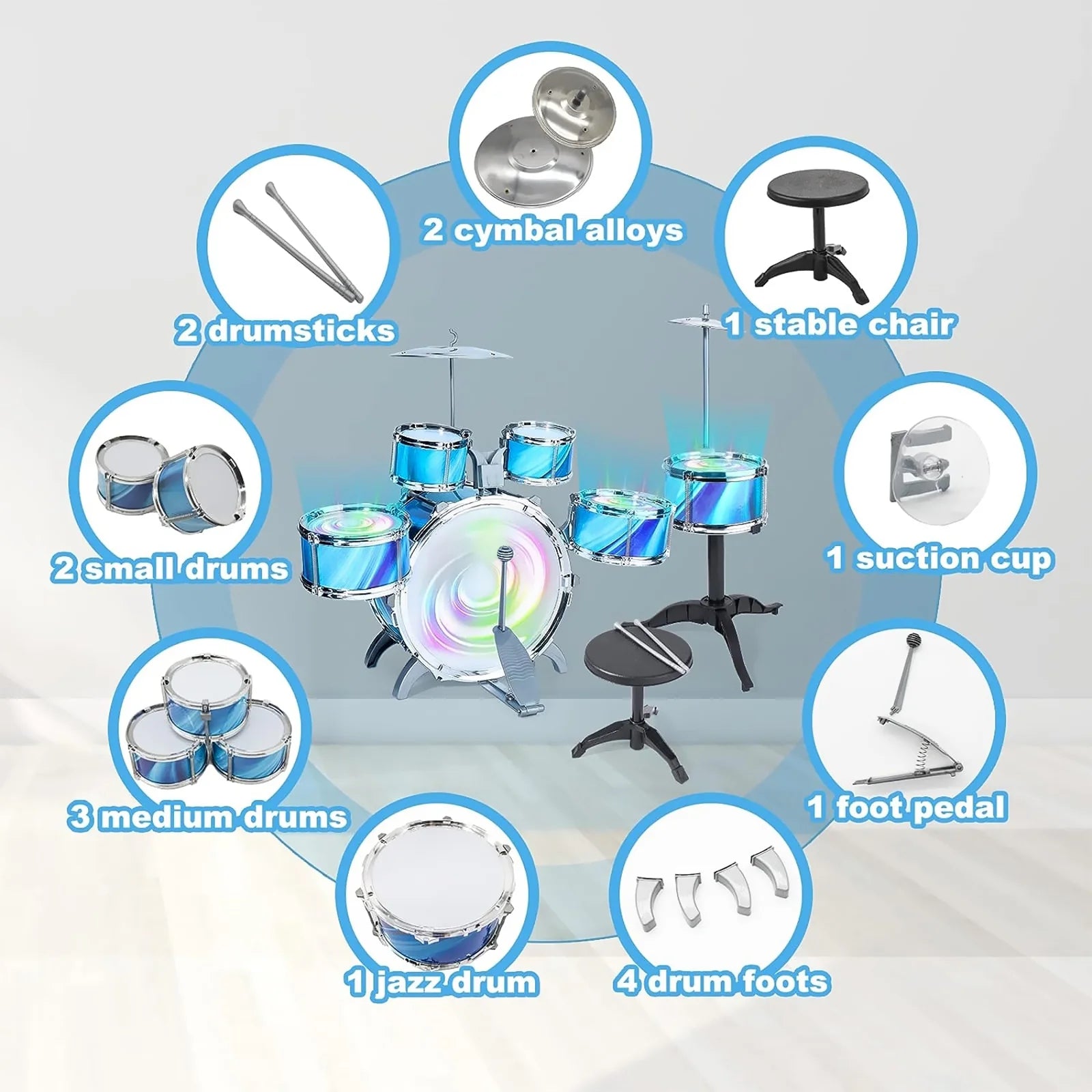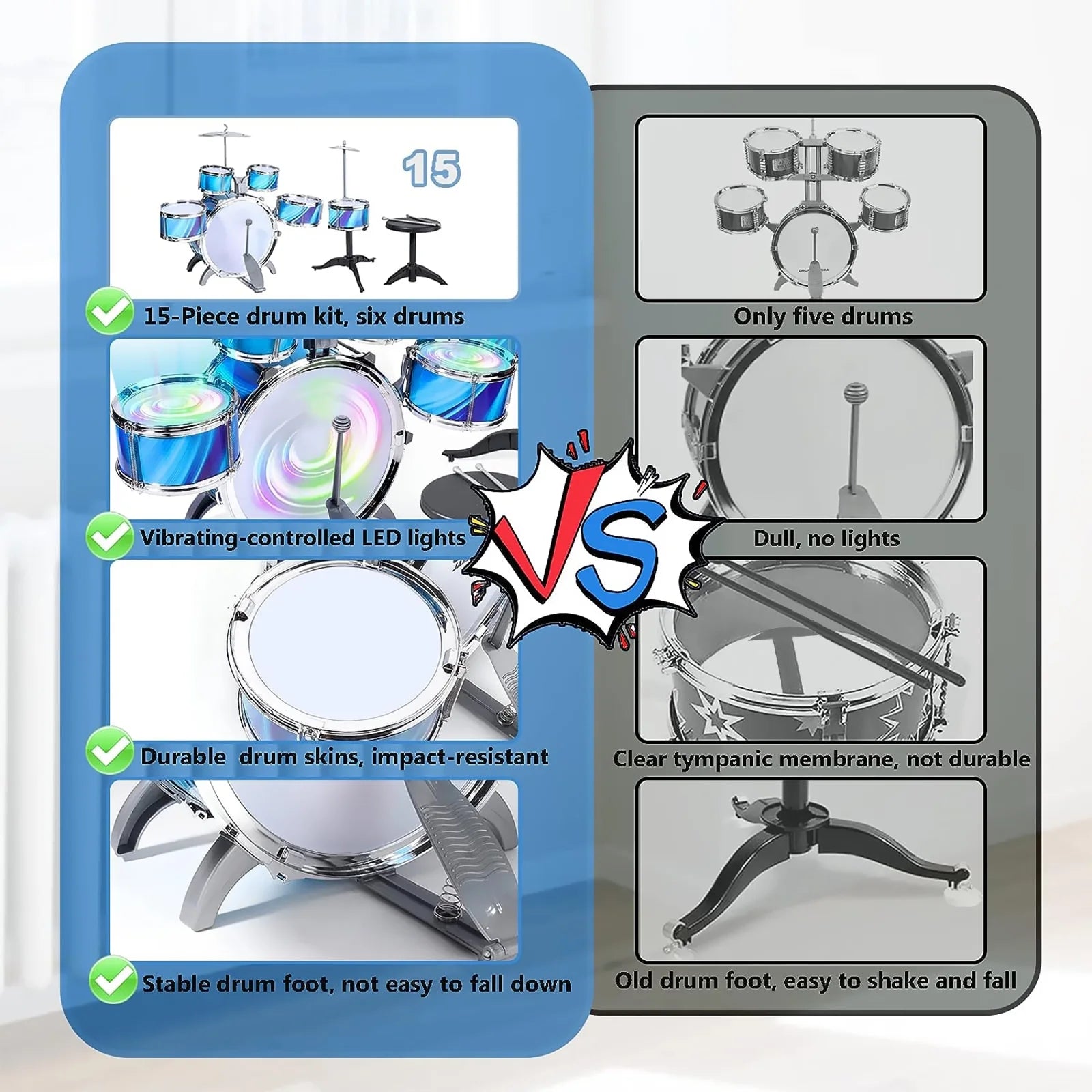 Our 15 pieces kids drum set comes with a jazz drum, three medium drums, two small drums, two cymbals, a stool and a pair of drumsticks. It is perfect as beginners in learning and practicing drum. It would help them enhance their musical skills and at the same time enjoy this as their past time. This drum toy is a great musical instrument for developing children's sense & creativity of music rhythm.