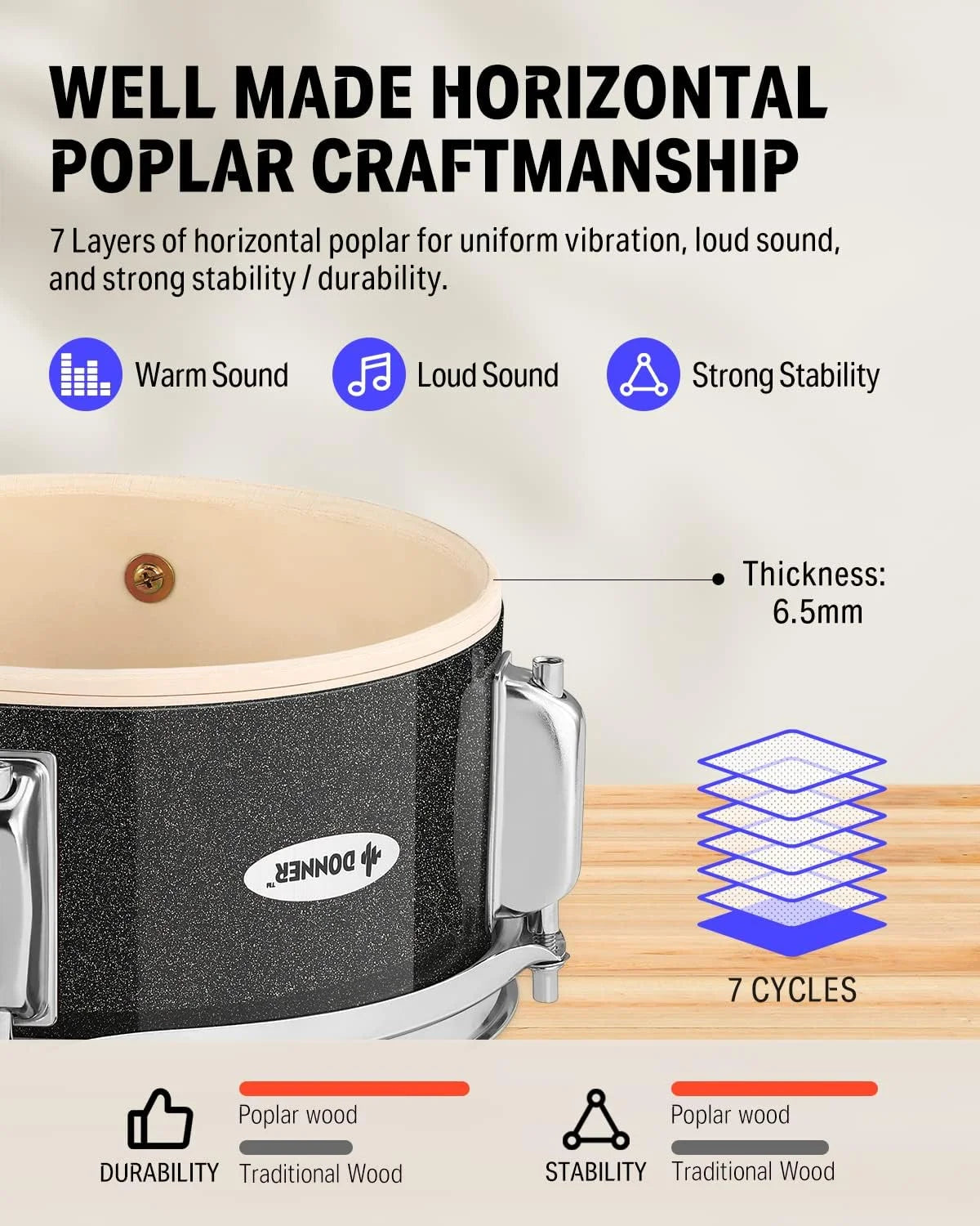 The 14" drum for easy set up while providing a small footprint and taking up minimal space. The set also comes with a pair of wooden kids drumsticks so the playing can start right away.