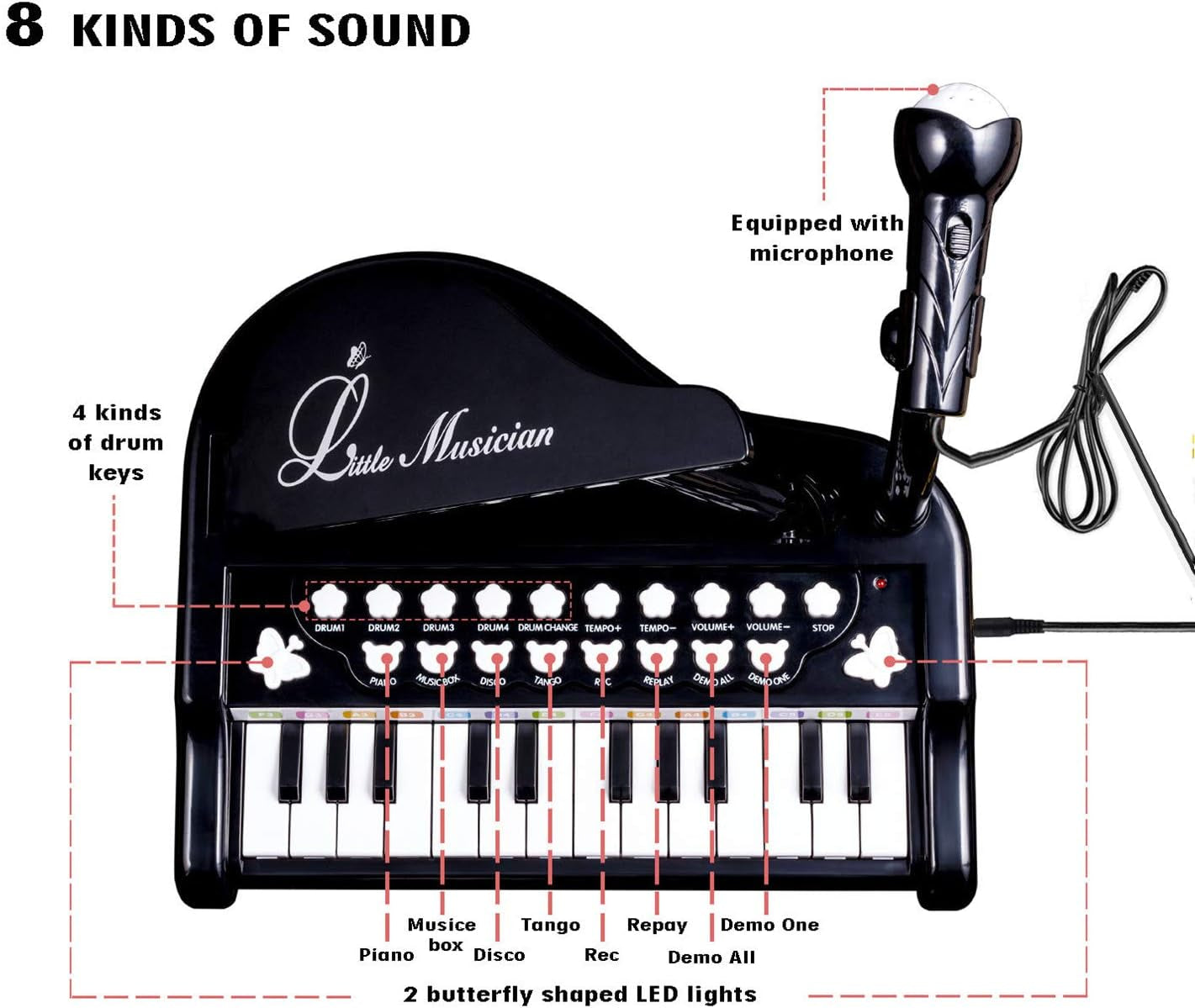 • Multi-functional Piano for Kids - 24-KEY design kids piano with microphone, includes 8 percussion instruments, 4 musical instruments, 22 demo songs, volume and rhythms control, “play & record”, LED, external MP3 and mobile phone, allow your baby to immerse in music world