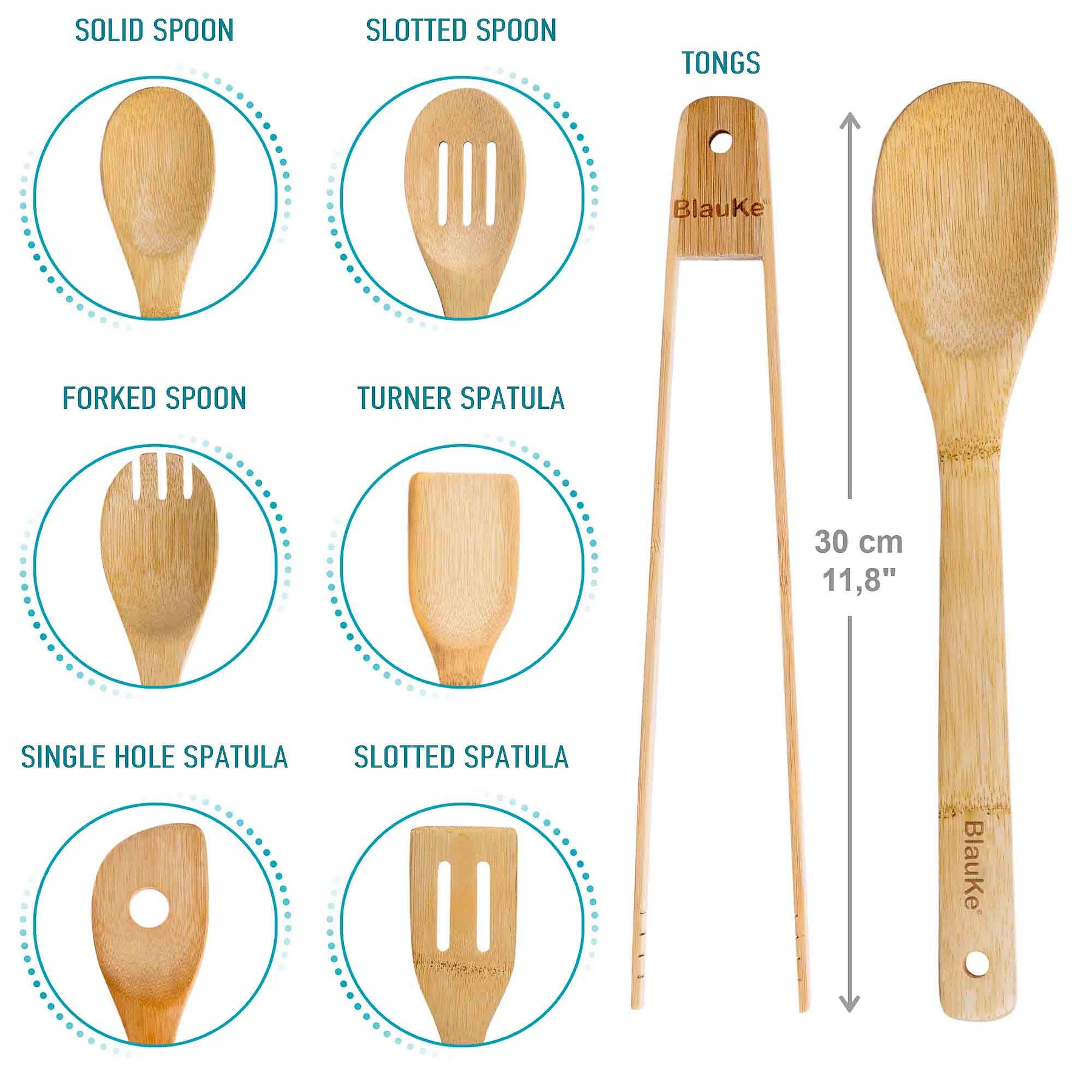 This 7-piece wood cooking utensils set is perfect for many kitchen tasks such as baking, stirring, cooking or serving. We've created these kitchen tools based on the daily needs we encounter in our own professional kitchen - a truly complete wooden kitchen utensil set.