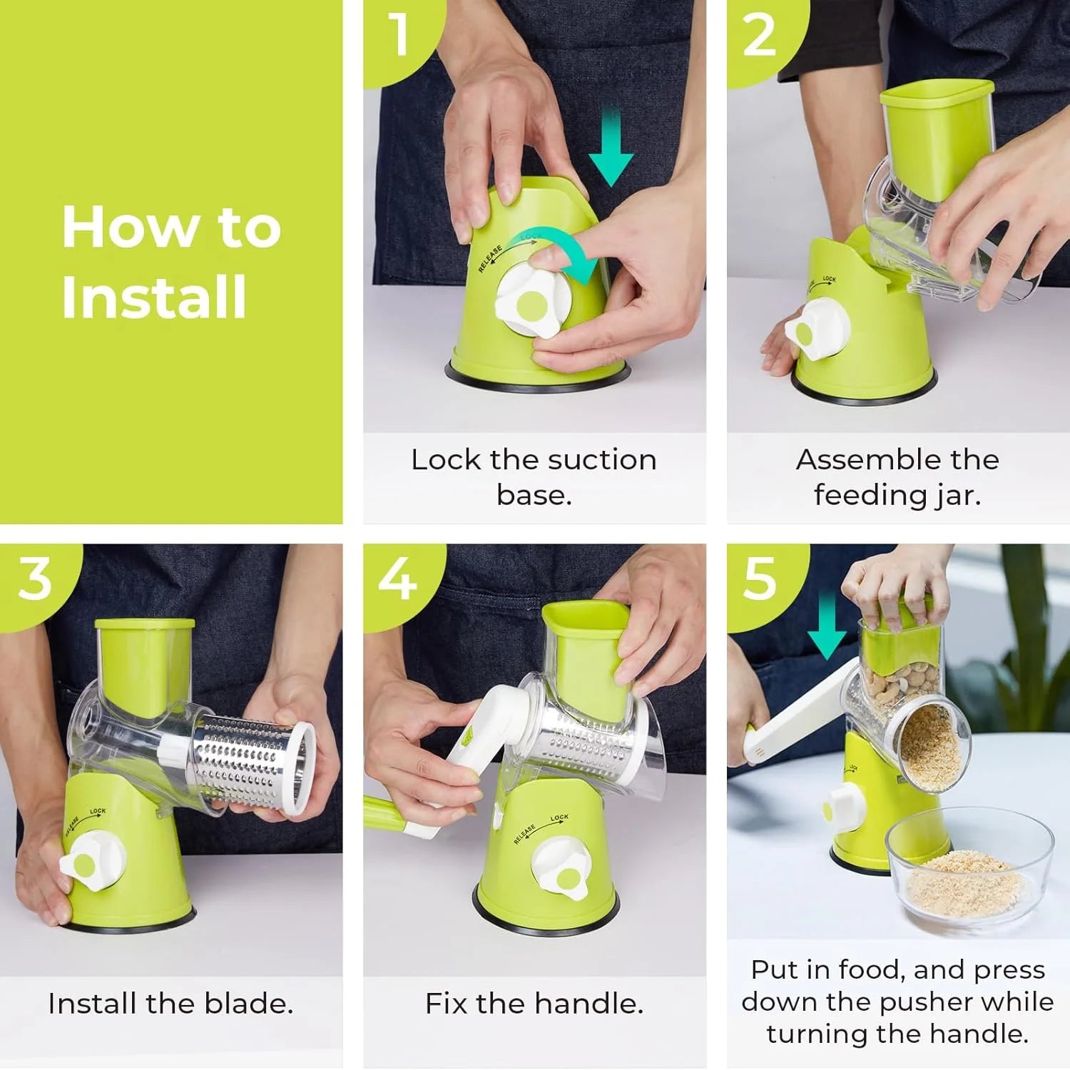 3-in-1 Grader, Shredder, and Slicer. Effortlessly grate, shred, and slice various ingredients in seconds, including Cheese, Salads, Hash Browns, Cauliflower Rice, Potato Chips, Pizza Toppings, and more. All-in-one design saves space in your kitchen cabinets and ensures a clutter-free environment. Coarse Shredder: Ideal for cabbage, potatoes, carrots, cheese, and more. Perfect for making coleslaw and various salads. Super Slicer: Suitable for cucumber, zucchini, and potatoes. Delivers thin slices, great for homemade chips or salads. Fine Grater: Perfect for grating cheese, biscuits, nuts, and even onions for dips and dressings. Tips: Includes 3 interchangeable stainless steel drums (grater, shredder, slicer) for greater versatility. Stainless steel drums are dishwasher safe (top rack). For optimal suction, use on a smooth surface.
